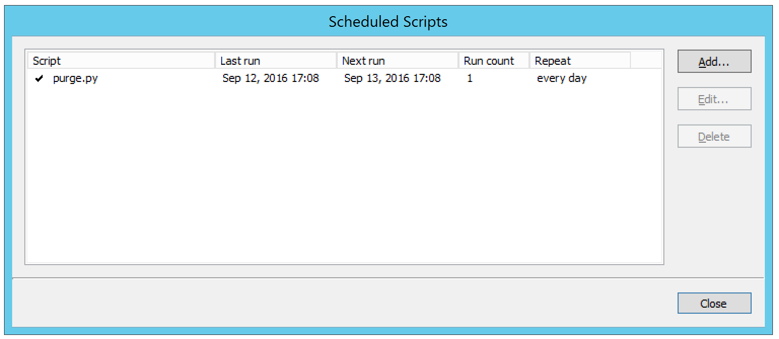 From the menu bar, select . The Scheduled Scripts dialog box displays. Any already defined scripts are displayed.