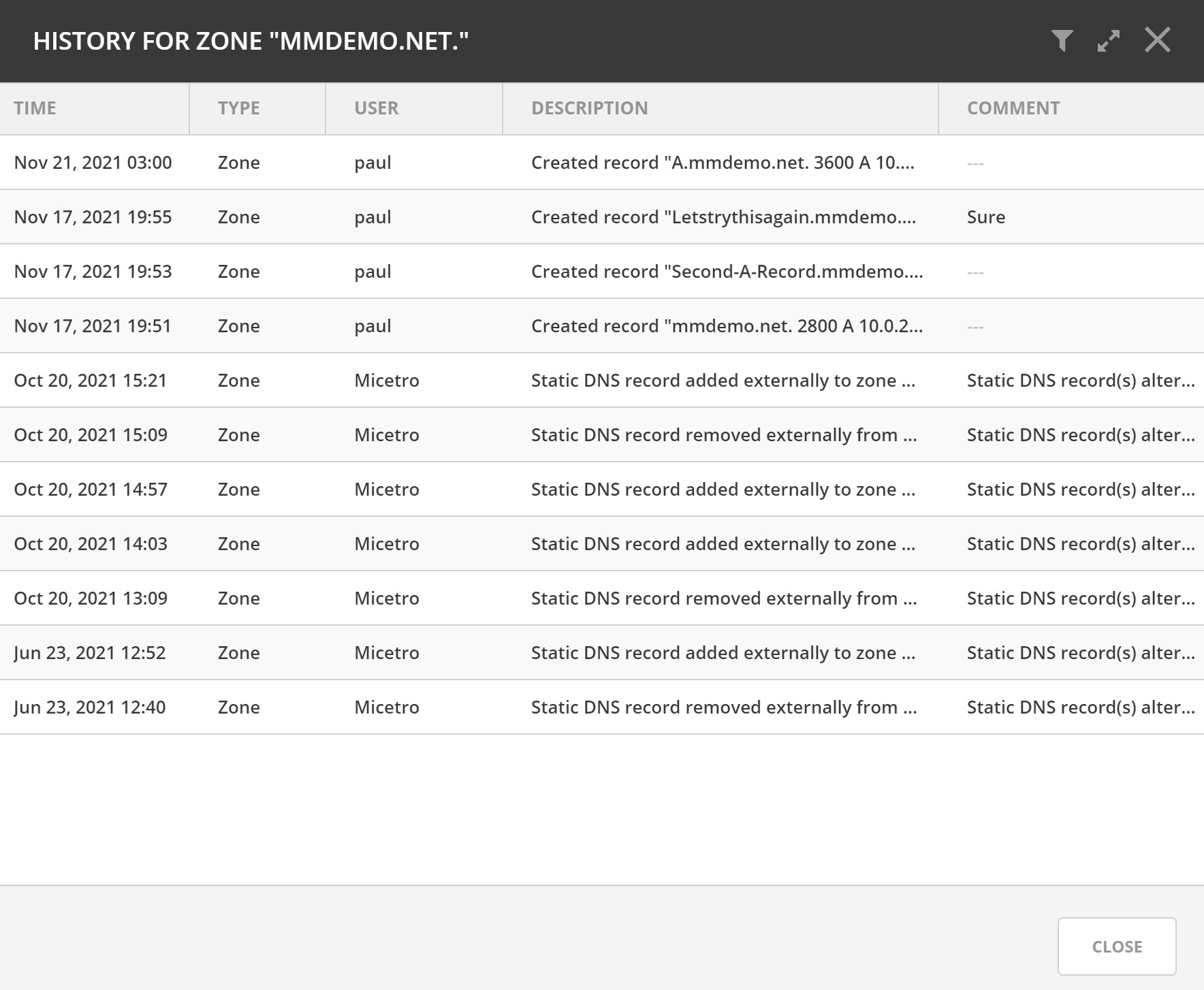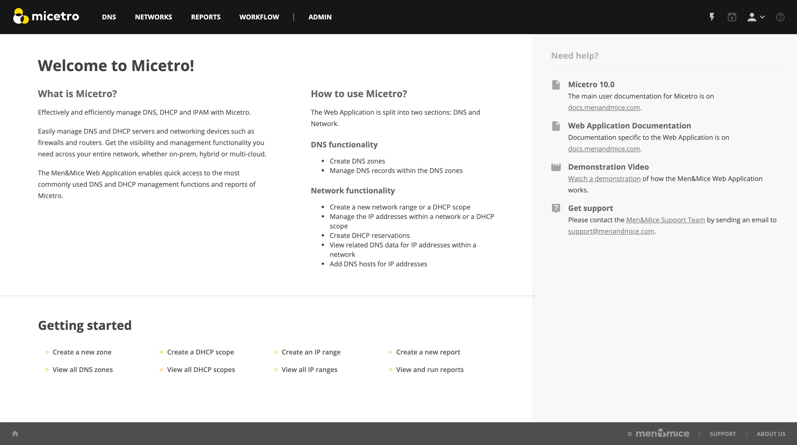 The web application is centered around the grid listing objects in the system. (For example: DNS zones, DNS records, IP address ranges, DHCP scopes, IP addresses, etc.)