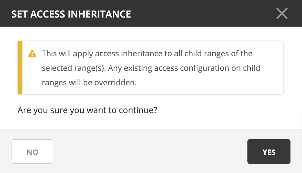 Using the Action –> Access action from the top bar or ellipsis menu allows you to disable or enable access inheritance by checking the Inherit access from parent range checkbox.