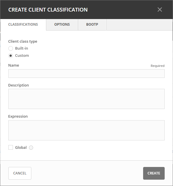 Select the Global checkbox if you want to create the client clss on all active Kea servers. Any modification or removal action on that client class will be replicated on all the active Kea servers.