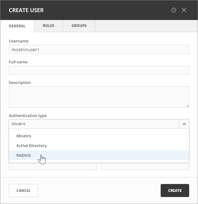To add a new user, click Create. Fill in the details, selecting RADIUS from the Authentication type drop-down list. For more information about how to create users, see Users.