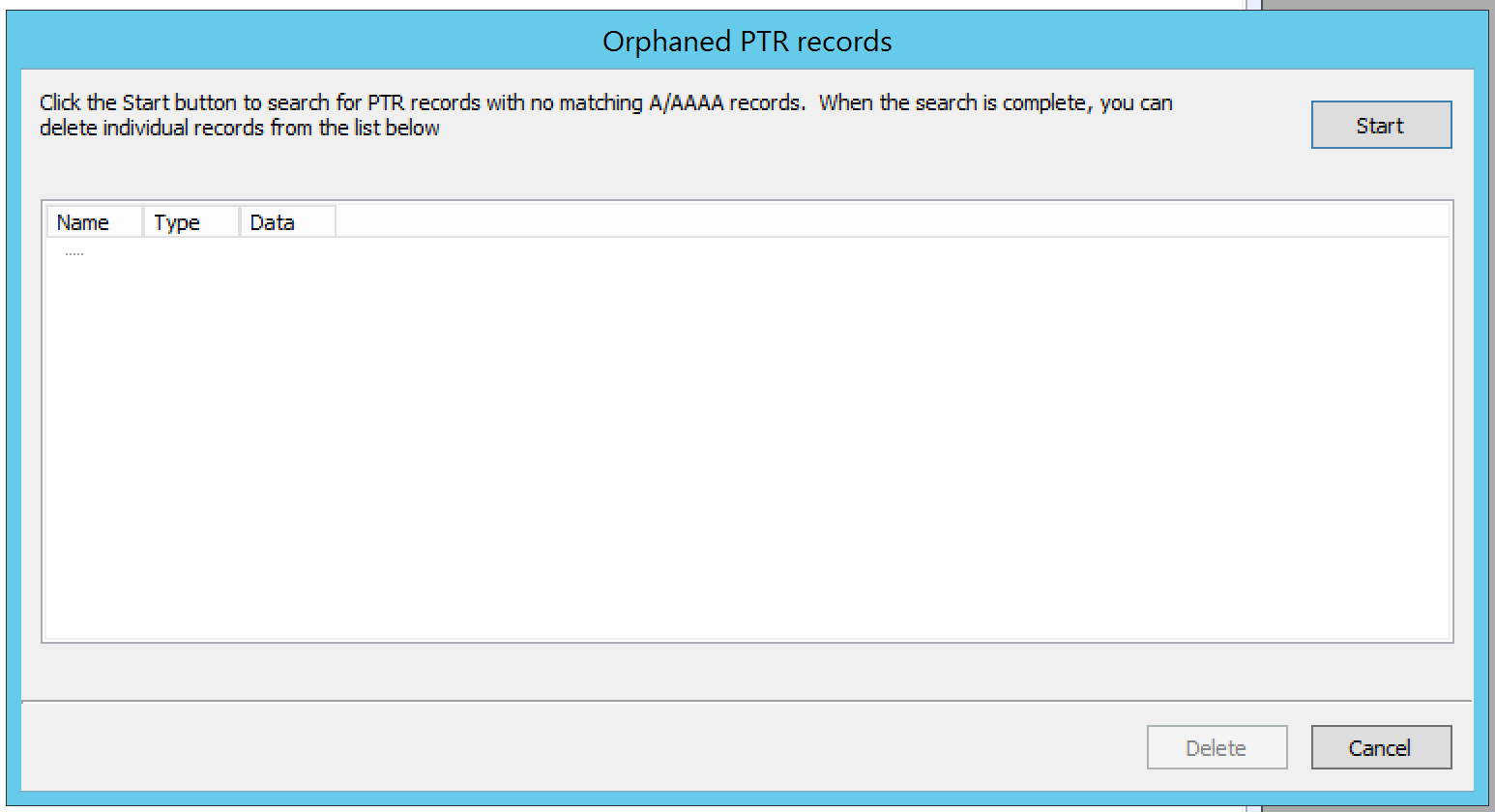 The Find Orphaned PTR Records maintenance operation allows you to see and remove orphaned PTR records in reverse zones. PTR records that have no corresponding address (A) records in the system are considered orphaned.