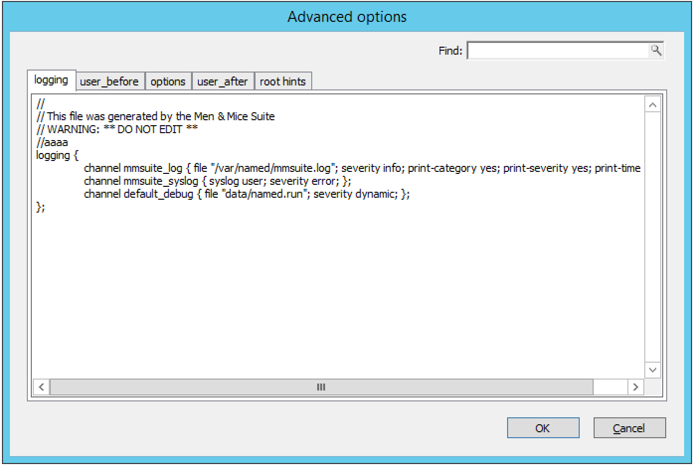 When the Advanced Options dialog box displays, you can edit the options for the zone or server in a text document. The dialog for editing server options contains four tabs where each tab contains a section of the server options (logging, user_before, options, user_after). If the DNS server contains one or more views, each view displays in a separate tab where various settings can be changed for each view.