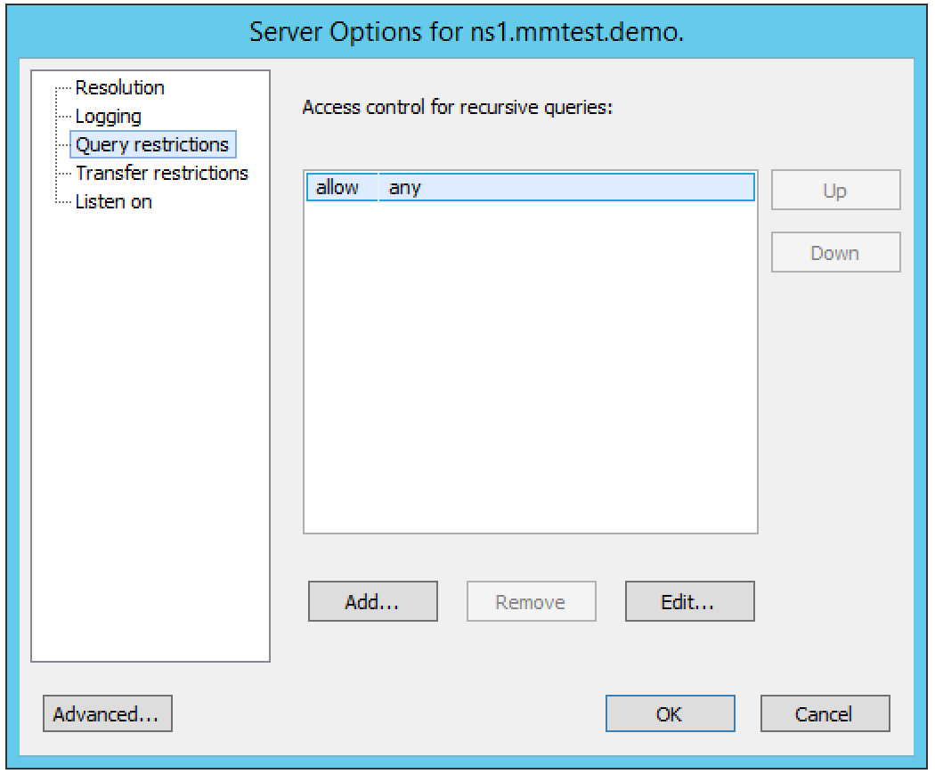The Query restrictions panel allows you to restrict recursive DNS queries to only certain IP Addresses or address ranges.