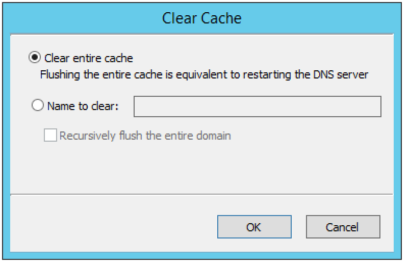 To clear a specific name, select the Name to clear radio button and enter the name you want to clear from the cache. If you want to clear an entire domain (the name entered and all names below it), select the Recursively flush the entire domain checkbox.