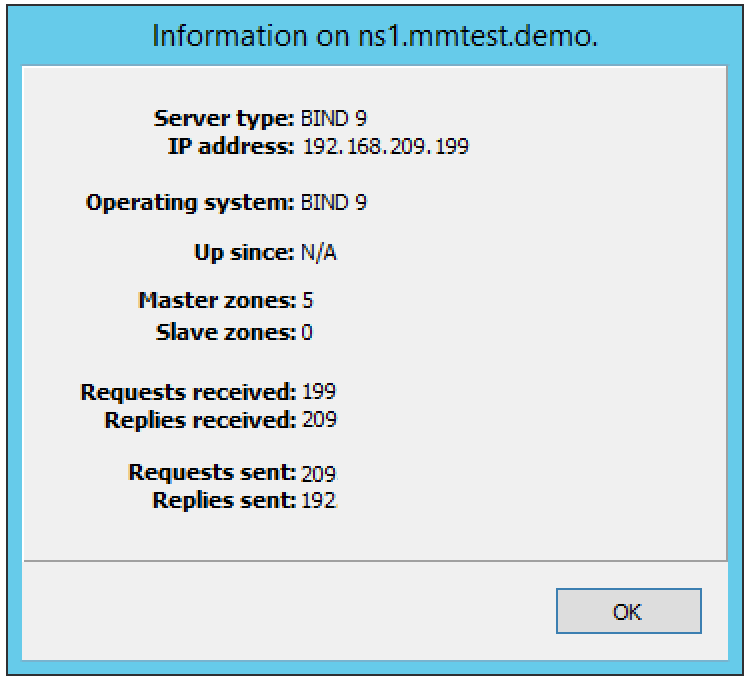 This command opens a dialog box that shows information about the history and status of the currently selected server in the Management Console. This includes such things as the server’s IP Address, operating system, number of requests & replies received, total uptime, and the number of master and slave zones it has. This command is only available when a server is selected in the Management Console.