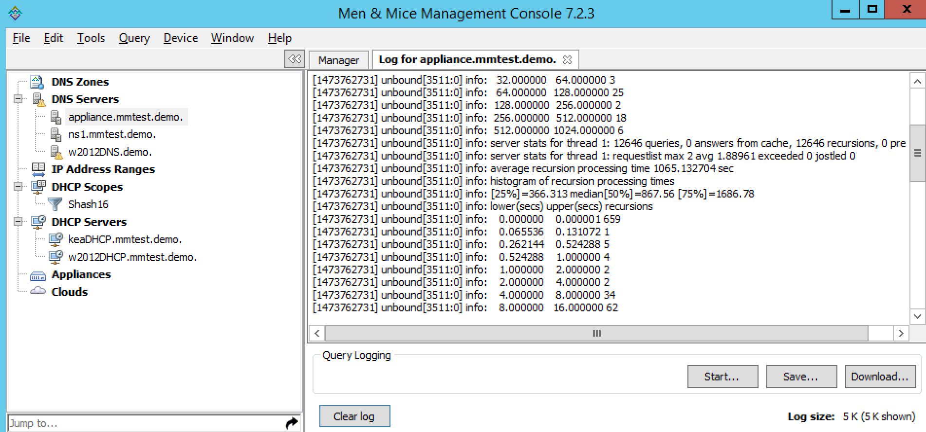 If the server log window is opened for a caching DNS server, the window will contain additional buttons related to query logging.