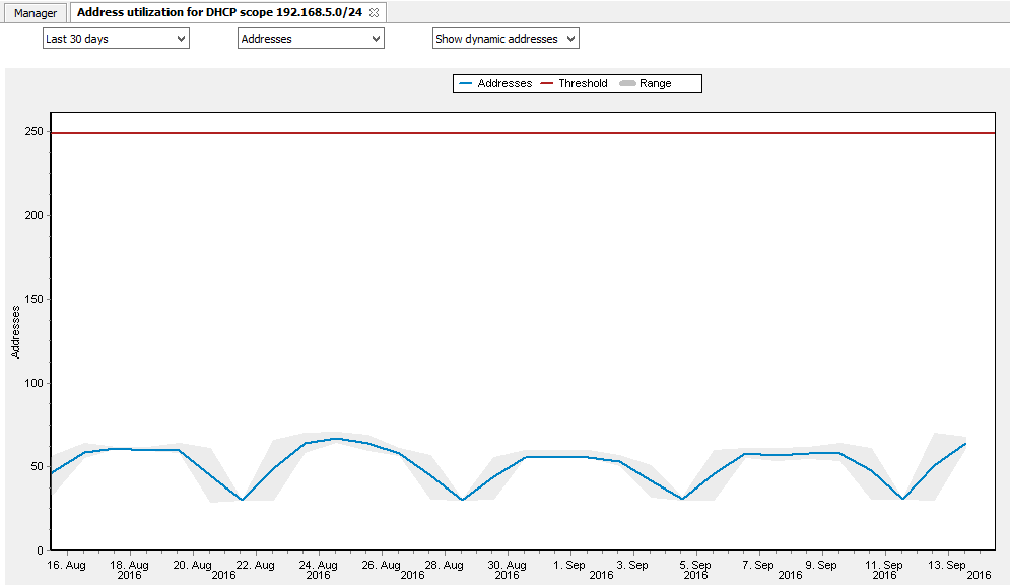 If the 30 day or 24 hour view is active, a gray ‘envelope’ is shown around the Addresses line. This shows the maximum and minimum utilization of addresses during the time period.