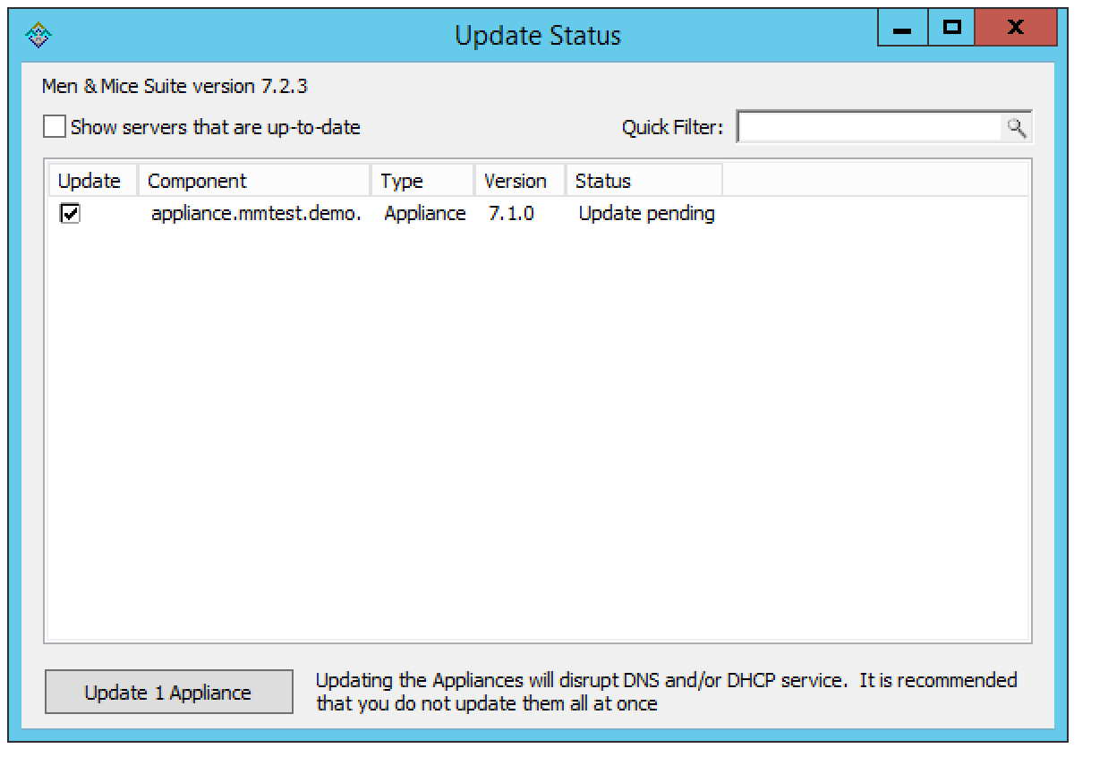 From the menu bar, select . The Update Status dialog box displays. The dialog box shows the update status for all DNS and DHCP server controllers as well as all Men&Mice Appliances. If an update is pending for an Appliance, the status is listed as Update pending and a checkbox is displayed in the Update column.