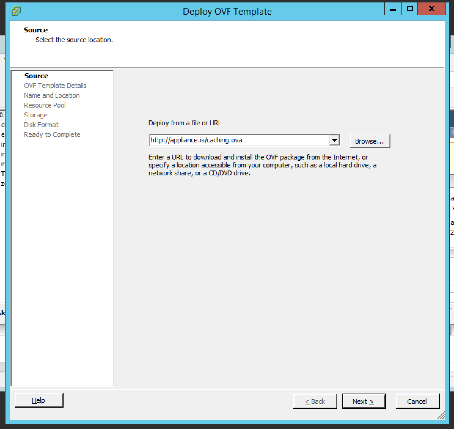 Paste in the deployment URL (http://appliance.is/caching.ova) as shown and press ‘Next’
