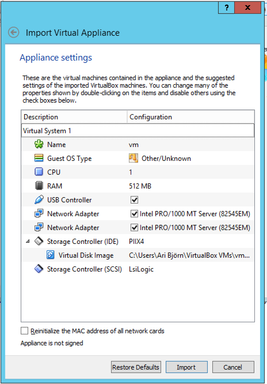 After specifying the name of the new virtual appliance, clicking Import will finalize the importing of the virtual appliance.