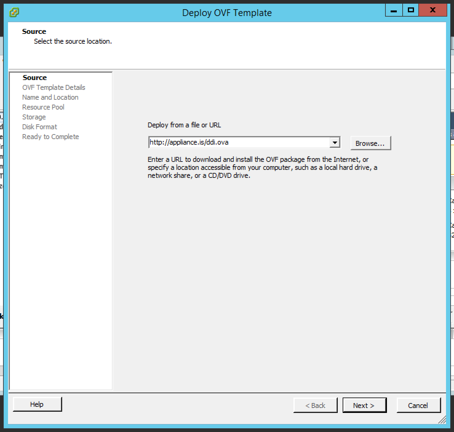 First, download the OVA file (http://appliance.is/ddi.ova) or use http://download.menandmice.com/Appliance/ for a specific version