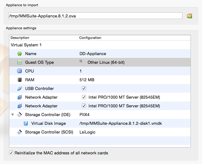 The next dialog page shows an overview of the settings. It’s recommended to select the option to re-initialize the MAC addresses of the two virtual interfaces eth0 (Management Interface) and eth1 (Service Interface) as shown in figure 3.