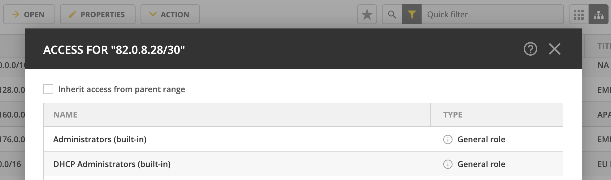 For containers, scopes, and ranges in the IPAM context, users with IPAM administration permissions can configure access inheritance. Access for objects set to inherit access from their parent cannot be edited. Editing access on the parent object will be applied to all child objects.