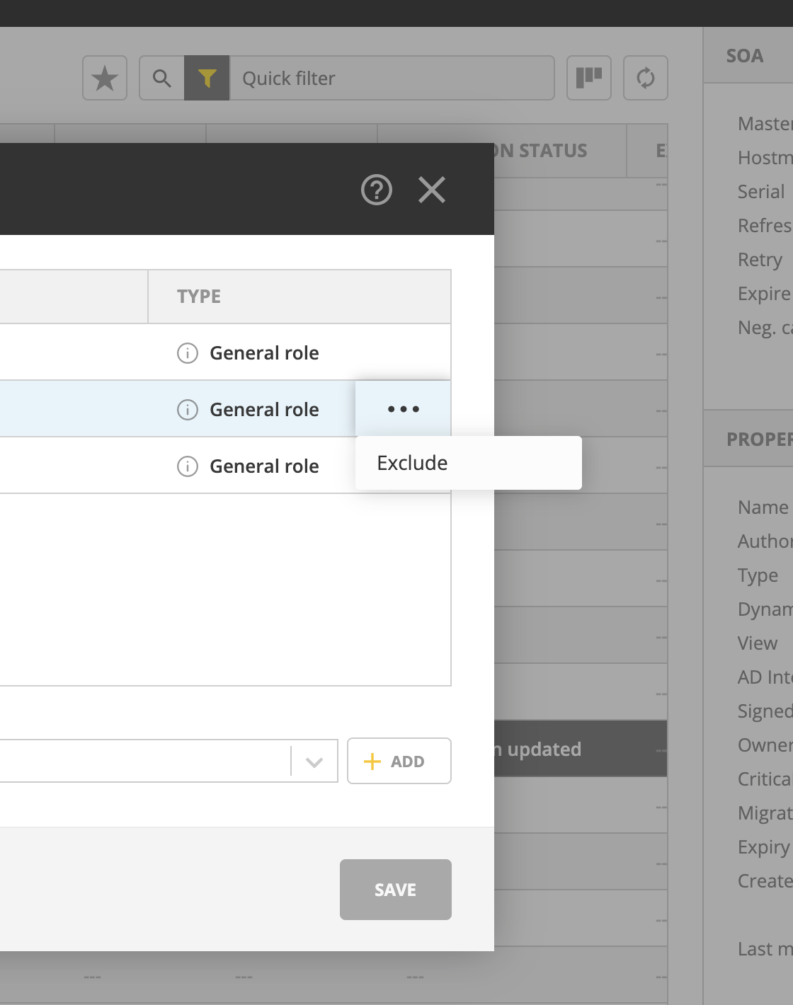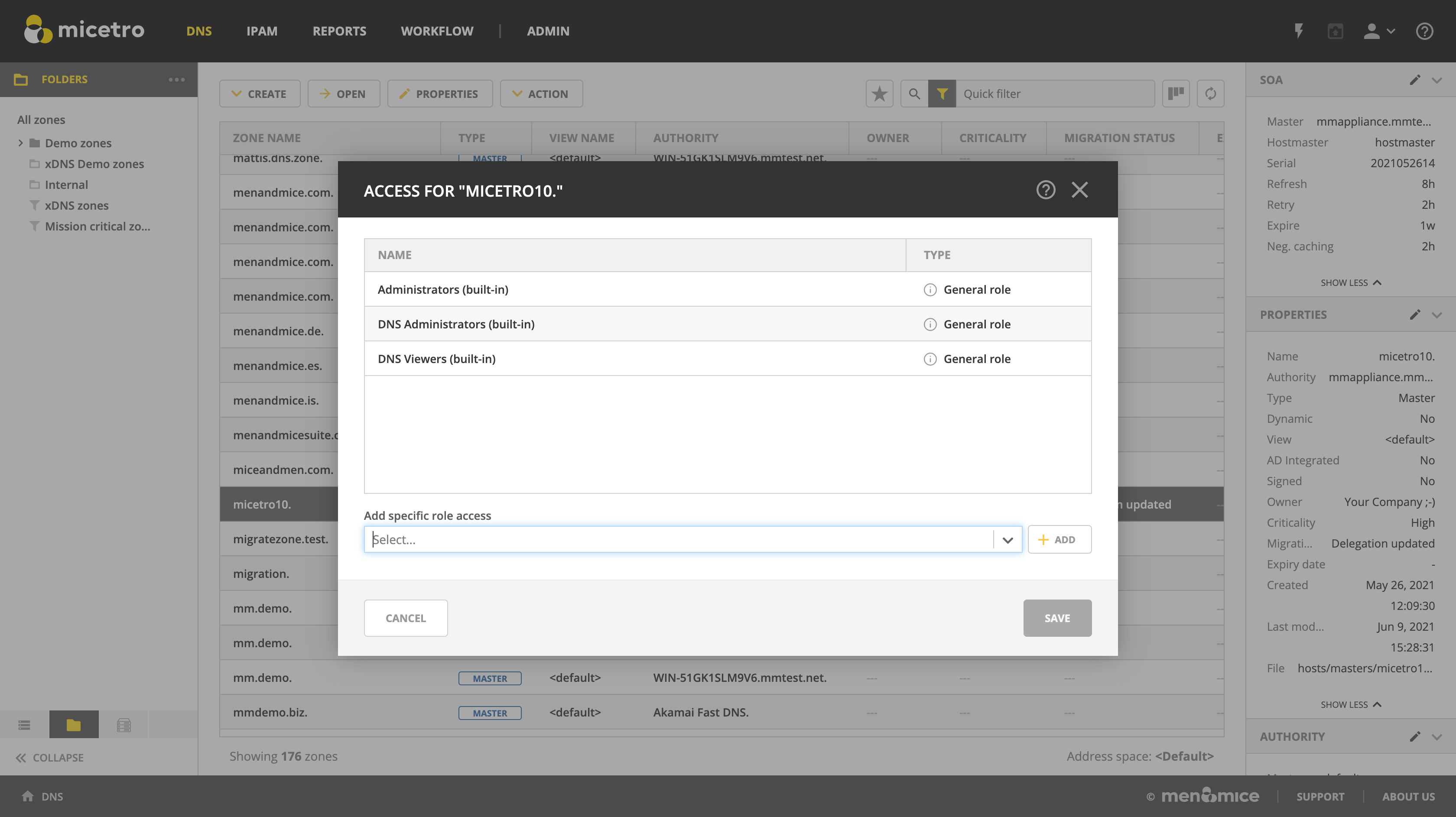 Single objects in the DNS, IPAM, and Admin contexts can be selected to examine and adjust access with the Action –> Access task from the top bar or the ellipsis menu.