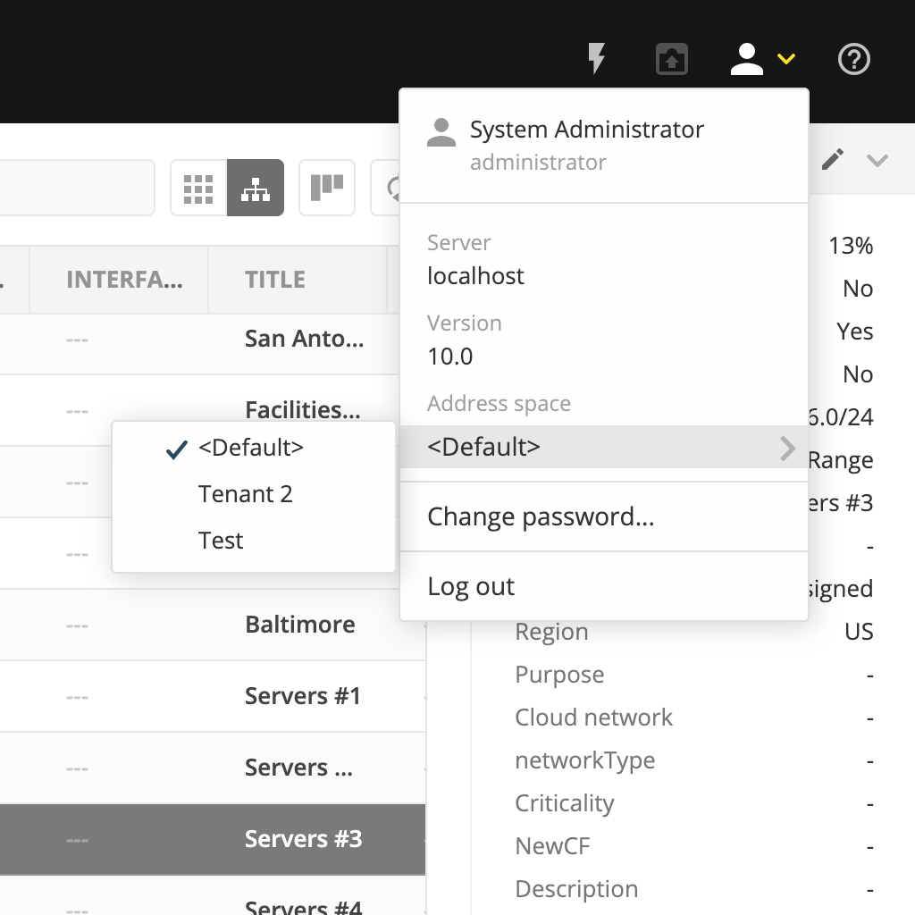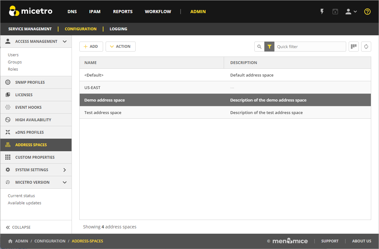 Micetro supports multiple address spaces, each containing its unique set of network components, such DNS servers, DNS zones, DHCP servers, DHCP scopes, IP address ranges (including both IPv4 and IPv6 root ranges), IP address entries, and folders.