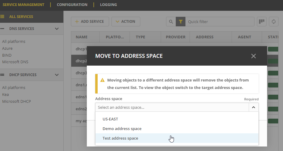 You can move DNS servers, DHCP servers, and IP Address ranges between address spaces. When an object is moved between address spaces, all properties for the object are retained, including its access settings and change history. You must have the relevant administrator privileges to move objects to a different address space.