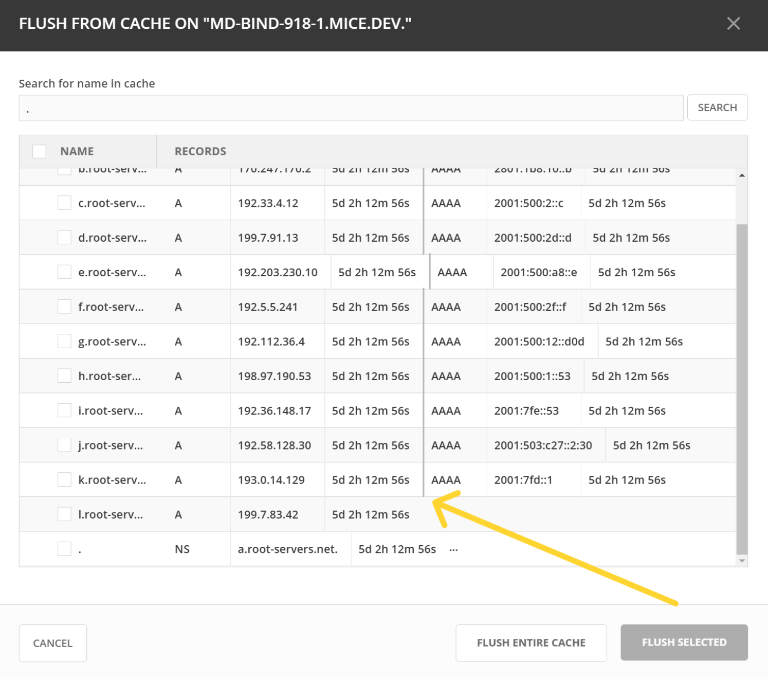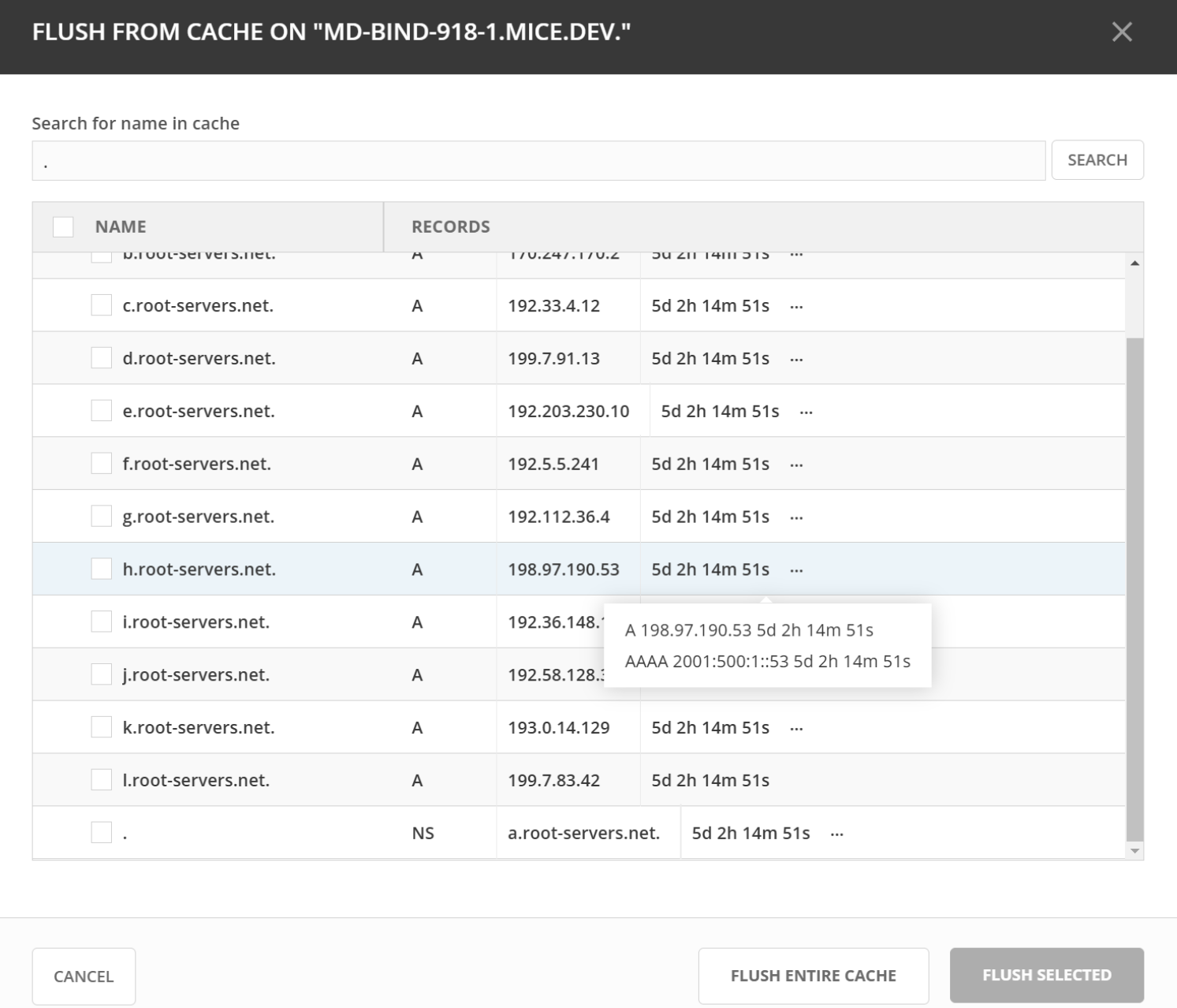 The entries in the DNS server’s cache will be displayed in the dialog.