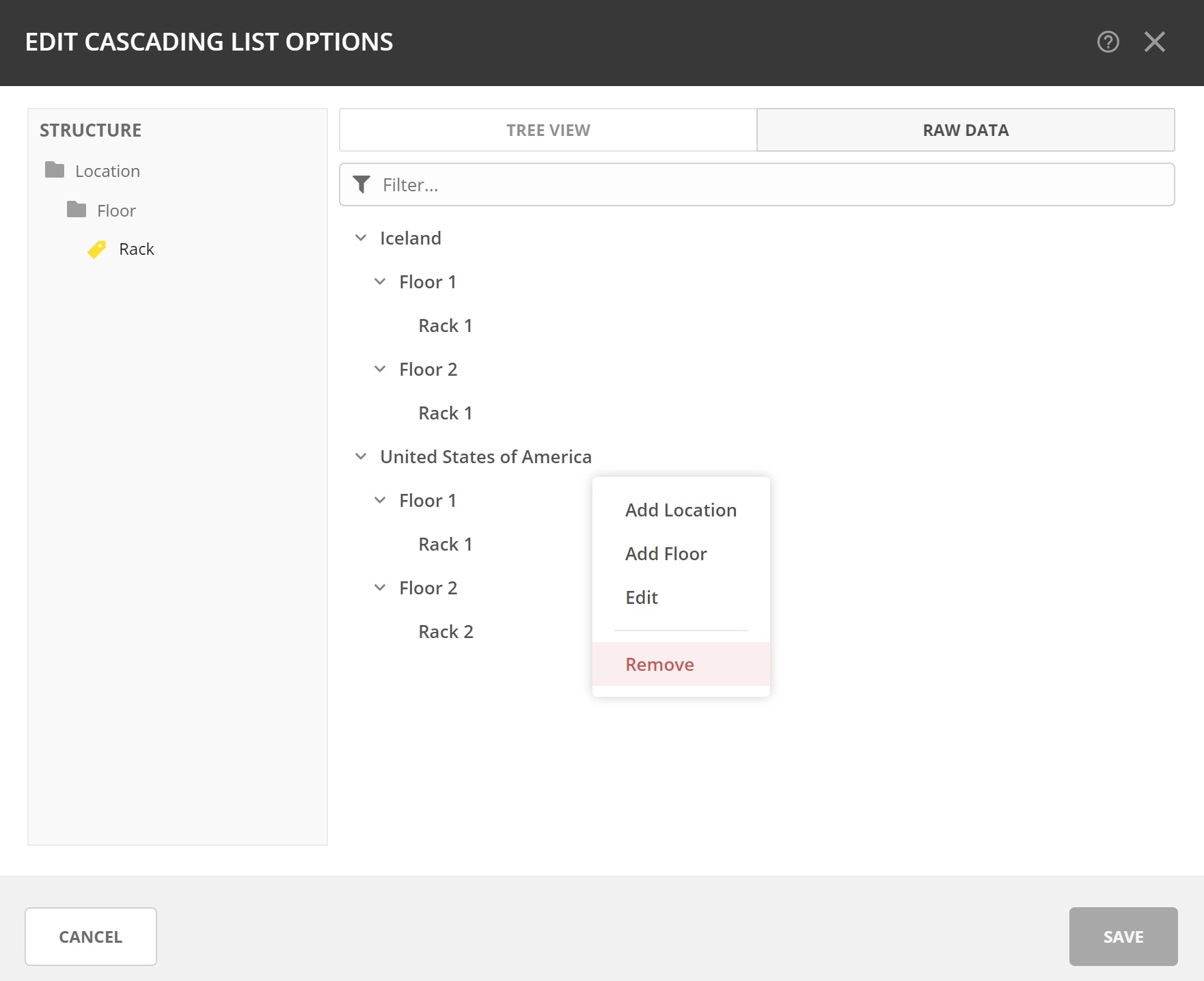 The Tree View is useful when editing the nested list manually. You may add, edit, or remove values for each nested list here. The Structure list on the left shows the available levels, with a yellow tag next to the child list