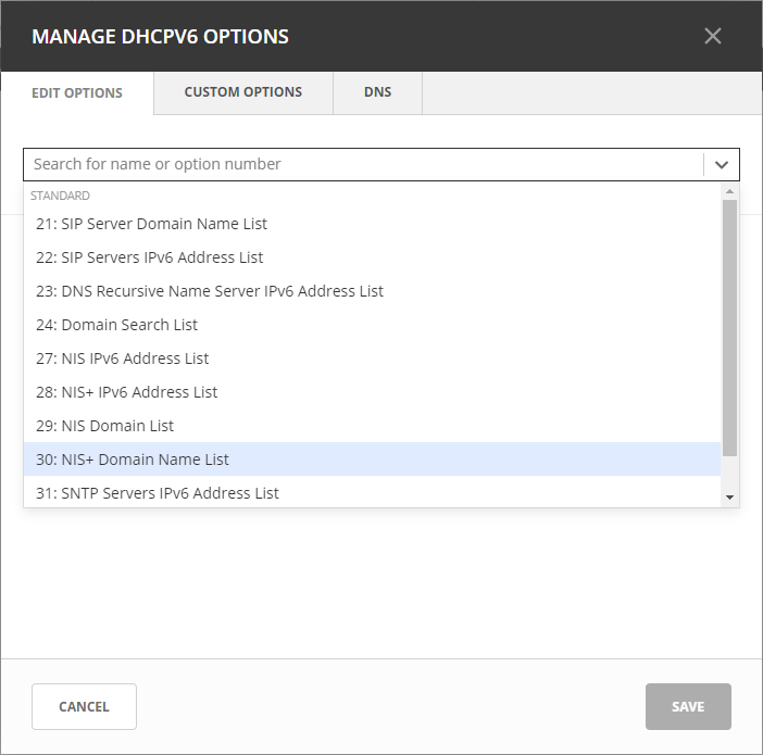 Select either Manage DHCPv4 options or Manage DHCPv6 options on the Action or the Row … menu.