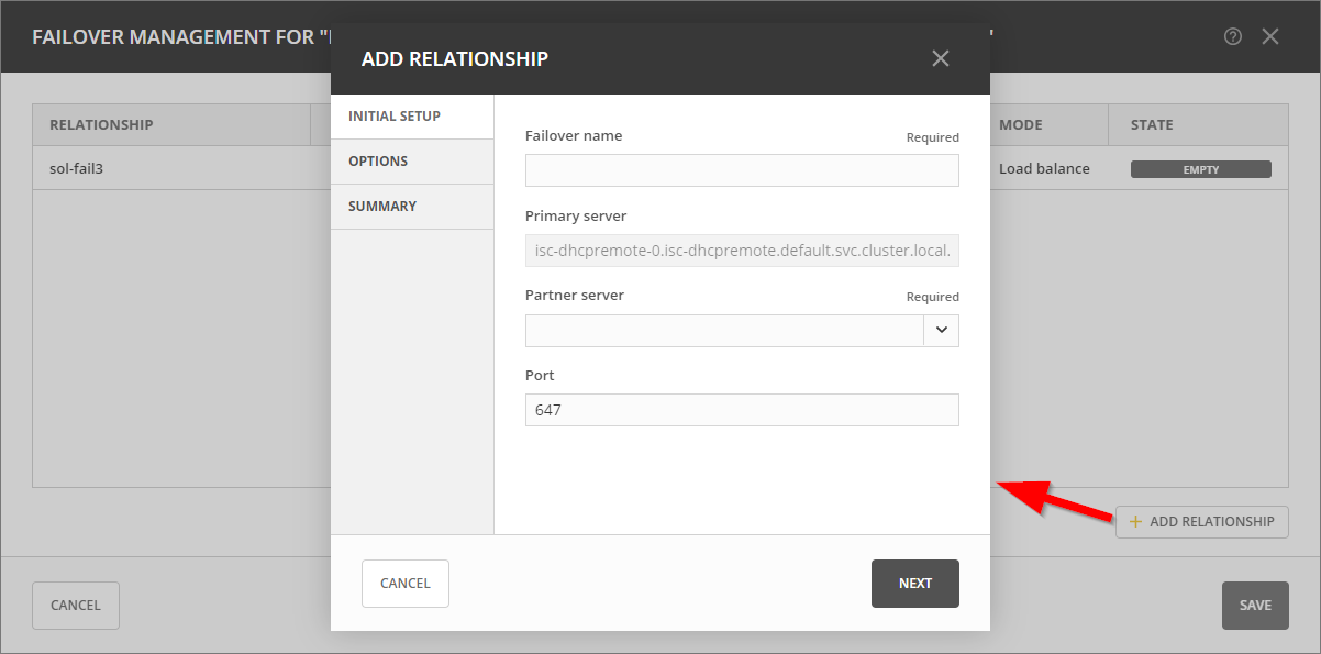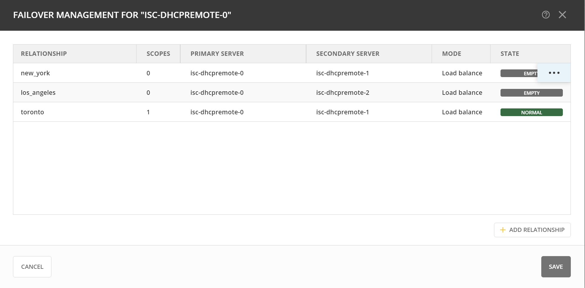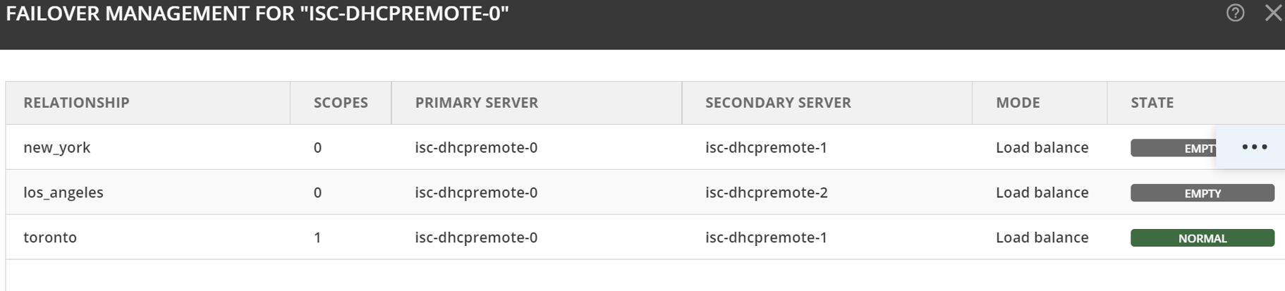 Select the ISC DHCP server housing the scope for which you want to establish failover configuration, and then select Failover management on either the Action or the Row … menu.