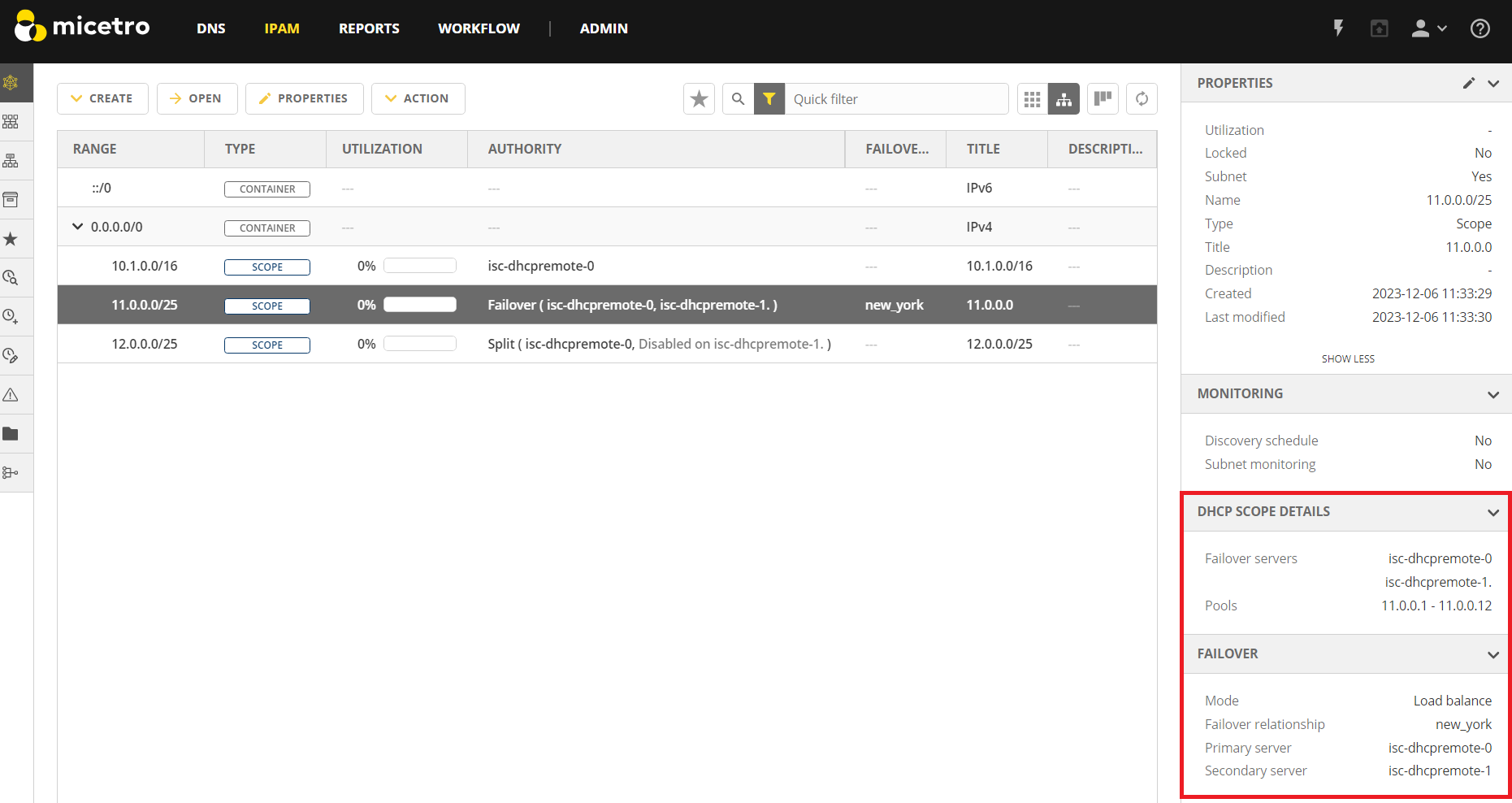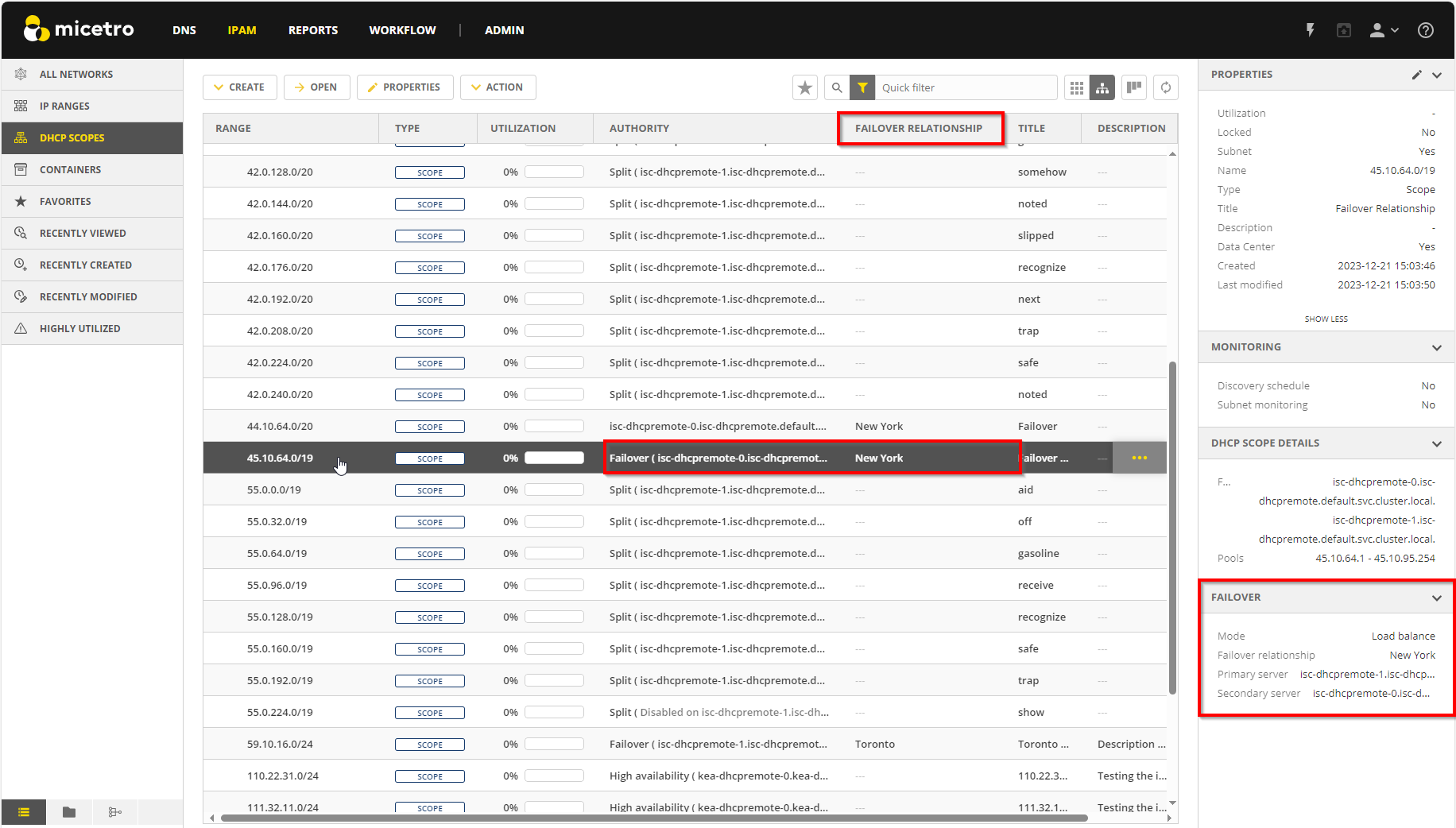 ISC DHCP scopes participating in failover relationships are grouped and labeled as such in the Authority column on the IPAM page. The Failover relationship column displays the name of the failover relationship to which the scope belongs.