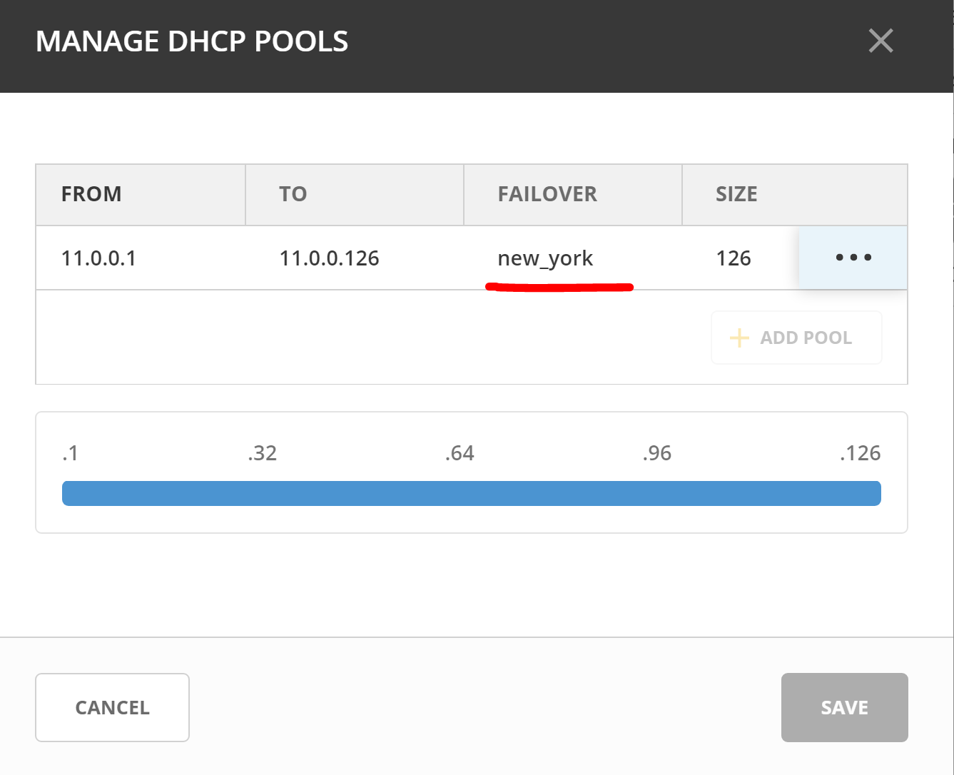 Failover relationships will initially appear as “Empty” and must be activated by adding a scope on the IPAM page. You can either create a new scope or select an existing one. Once you have added a scope, the failover peer statement will automatically be added to any existing pools within the scope. If the failover relationship was previously empty, it will be created on the ISC DHCP server.