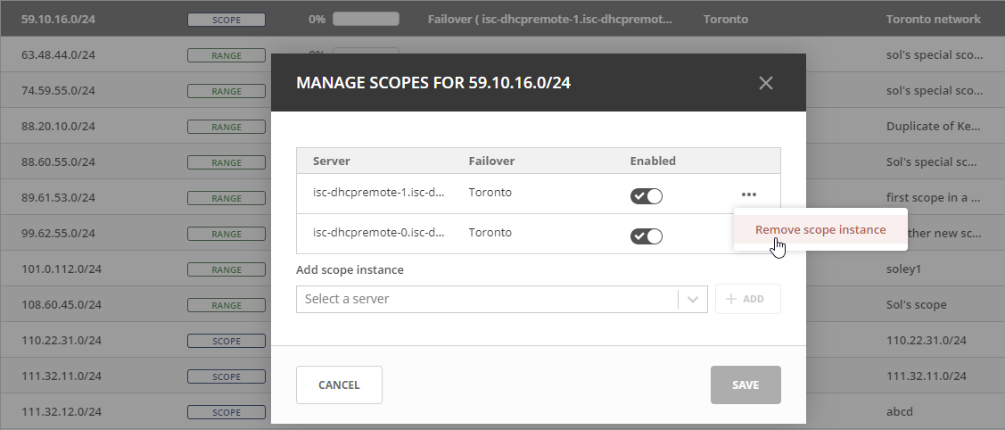 Locate the specific scope on the IPAM page, then select Manage scope instances on either the Action or the Row … menu. Select Remove scope instance for the relevant server.