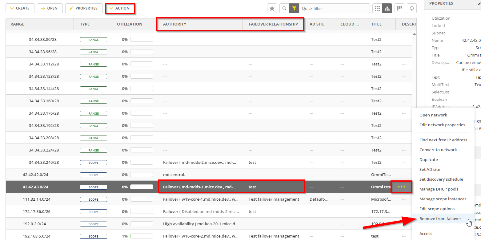 Locate the specific scope on the IPAM page, then select Remove from failover on either the Action or the Row … menu.