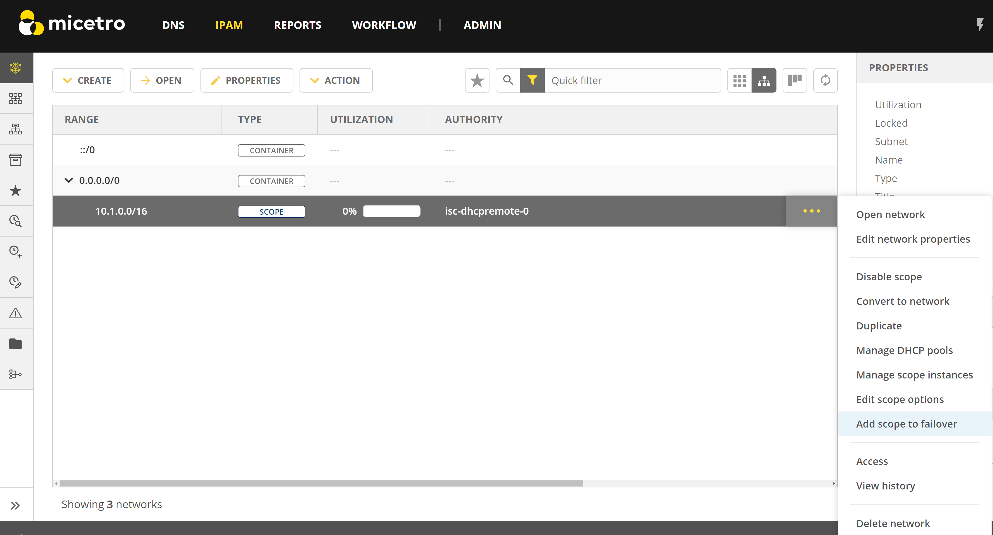 On the IPAM page, locate the scope, then select Add scope to failover on either the Action or the Row … menu: