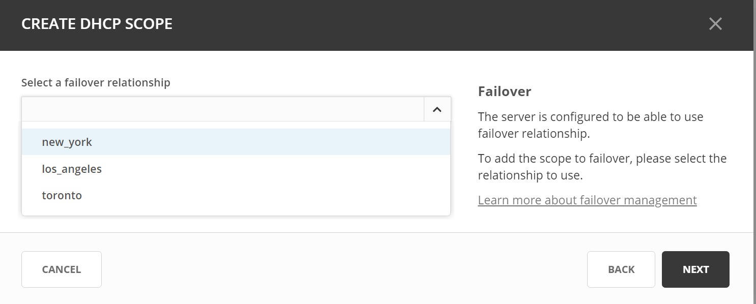 Failover relationships will initially appear as “Empty” and must be activated by adding a scope on the IPAM page. You can either create a new scope or select an existing one. If the failover relationship was previously empty, it will be created on the Microsoft DHCP server.