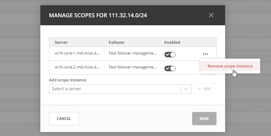 Locate the specific scope on the IPAM page, then select Manage scope instances on either the Action or the Row … menu. Select Remove scope instance for the relevant server.