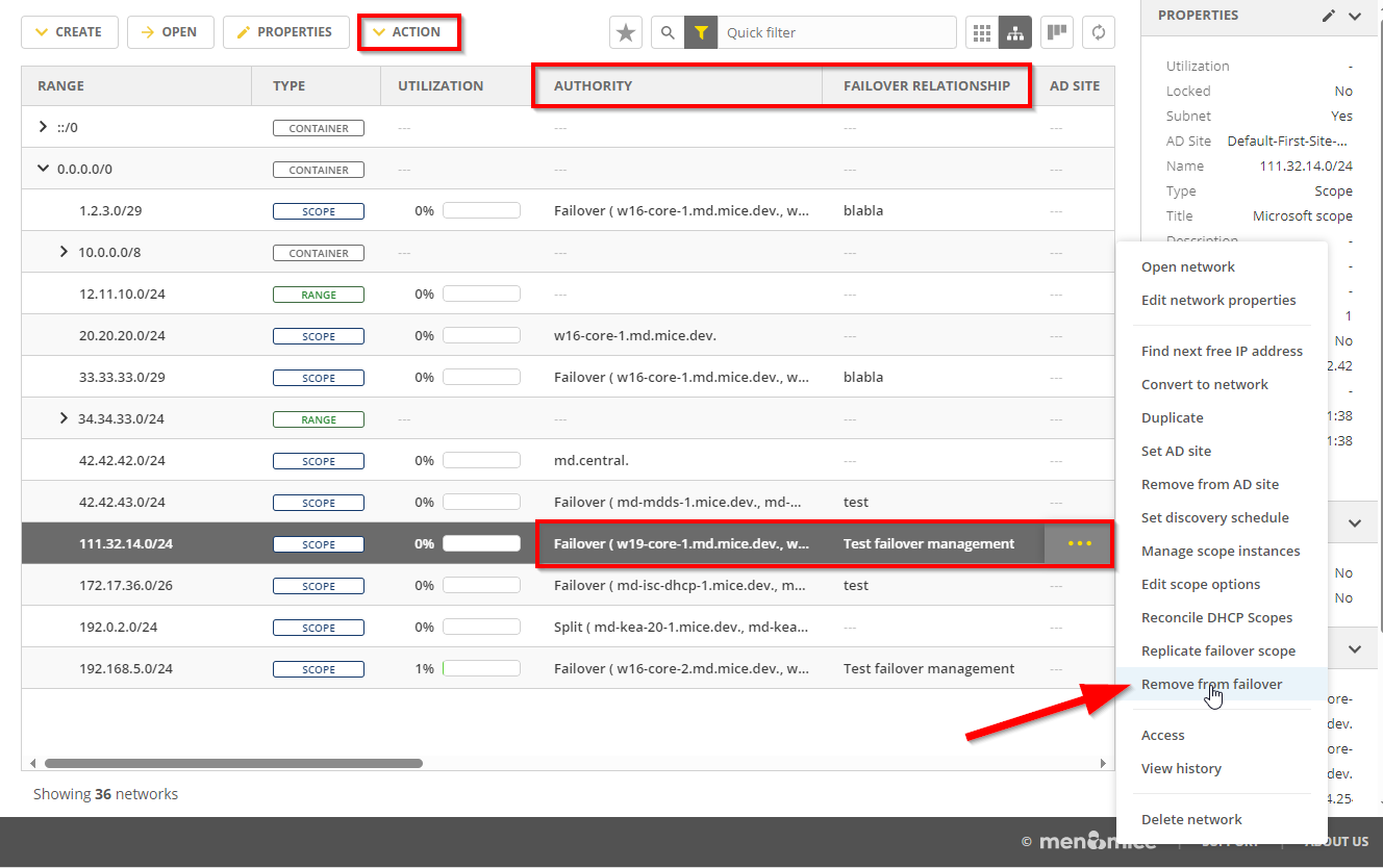 Locate the specific scope on the IPAM page, then select Remove from failover on either the Action or the Row … menu.