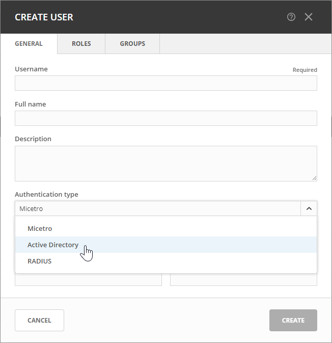 To add a new user, select Create in the task bar. Enter the user information into the dialog, selecting Active Directory from the Authentication type dropdown. For more information about how to create users, refer to Users.
