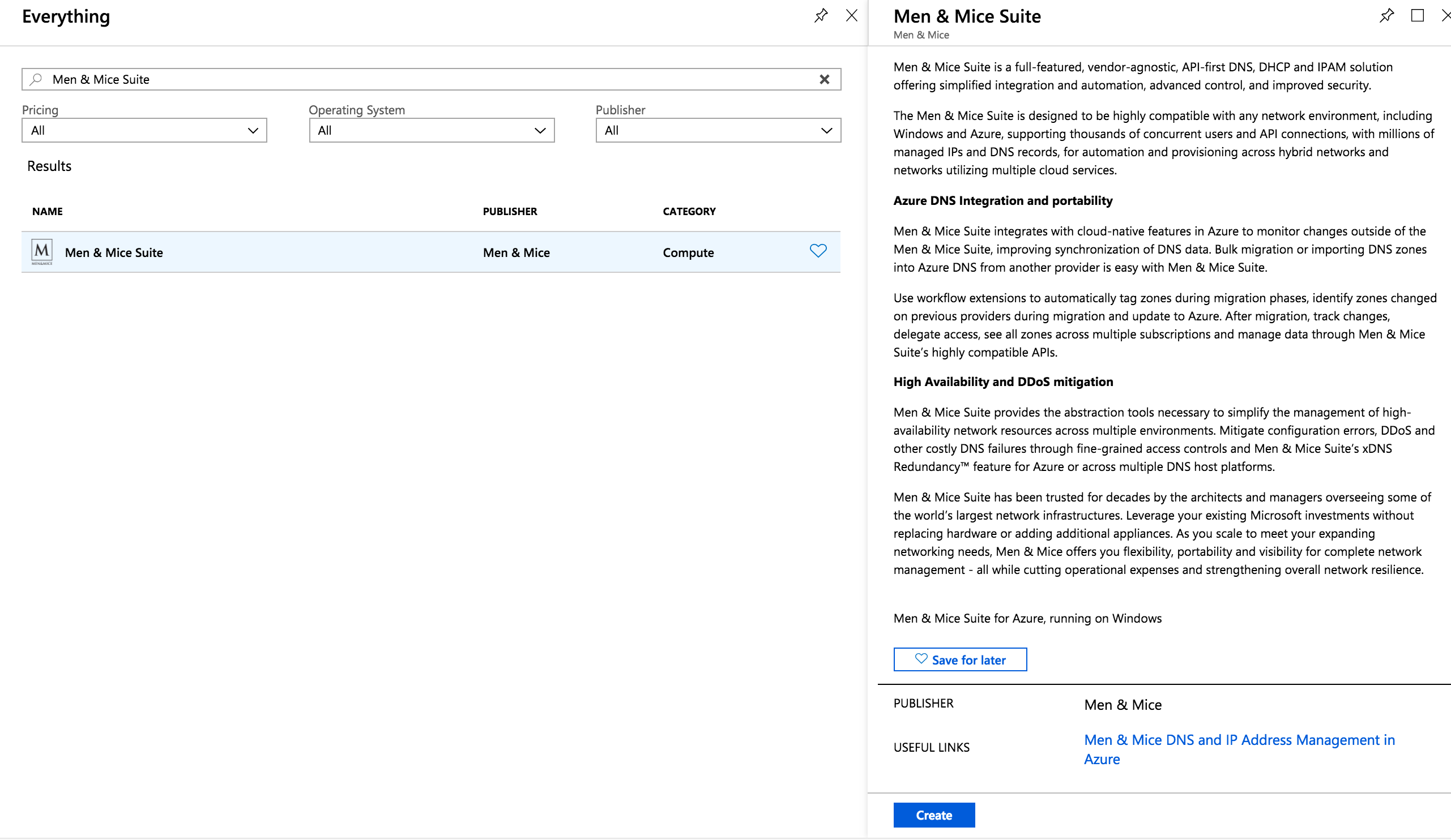 Enter the search term “Micetro”, click on the offering and there should open a sidebar to the right with a “Create” button.