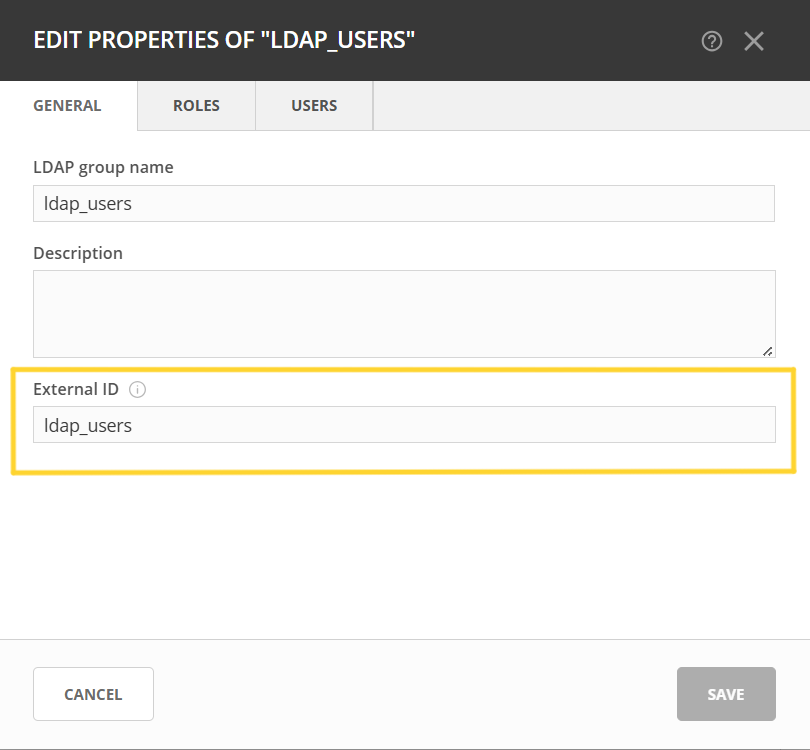 In the name_attribute field, cn (“common name”) refers to the group name in LDAP. In the LDAP configuration JSON file, enter cn in the name_attribute field if that attribute is used for group name in LDAP, not the group name itself.