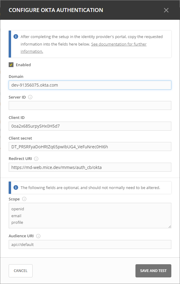 After completing the setup in Okta, the next step is to configure authentication in Micetro by entering the necessary information obtained during the application setup process. Once you have entered the information, save the configuration. Micetro then tests the integration with Okta to make sure it’s working properly.