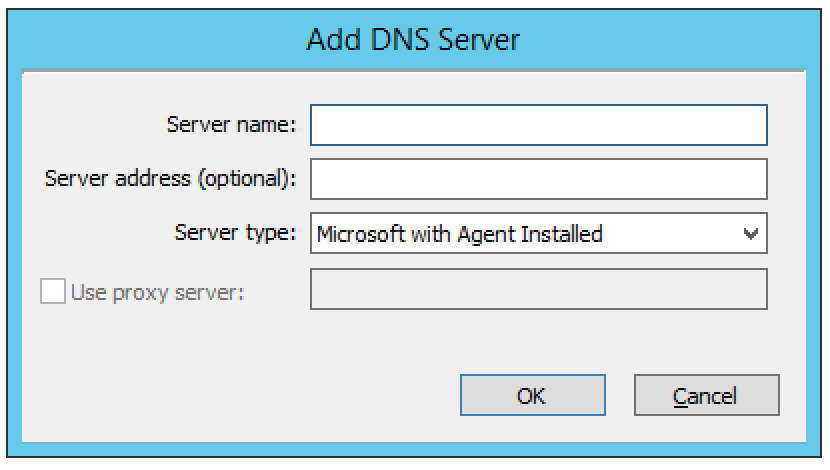 If you are adding a Microsoft DNS server you can specify the location of the DNS Server Controller by clicking the Use proxy server checkbox and entering the DNS name or IP Address of the machine running the DNS Server controller. This option allows the system to connect to DNS servers in different forests where a cross-forest trust does not exist. It also allows a non-Windows version of Men&Mice Central to manage Microsoft DNS servers.