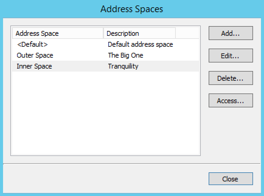 To create a new address space, click the Add button and enter the name and description for the address space. NOTE: When more than one address space is defined, the first address space will be named <default>. It is not possible to rename or delete the <default> address space. Also, the <default> address space is the only address space that shows AD sites if AD Site and Subnet integration is enabled. NOTE: When a new address space is created, you must set the access for the address space to allow users to access it. When creating your first address space, two address spaces will actually be created, the <default> address space and the address space you created. You must set access for the <default> address space as well as for the new address space.