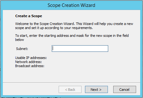 From the menu bar, select , or right click and select Convert to DHCP Scope. The Scope Creation Wizard will appear, with the subnet field pre-populated for the selected range.