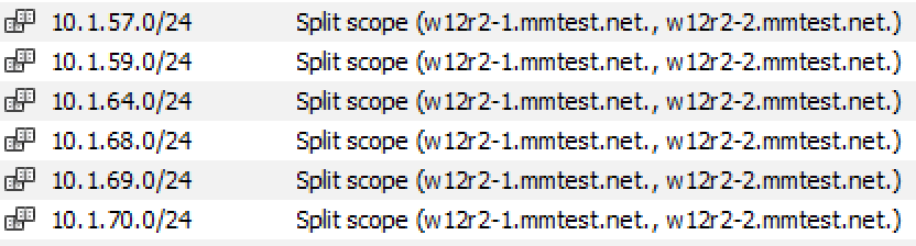 In the scope list, split scopes are shown with a different icon and in the server column, the text “split scope” displays