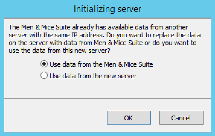 If Use data from the new server is selected, all data kept in Men&Mice Central will be ignored and overwritten with current data on the DNS Server.