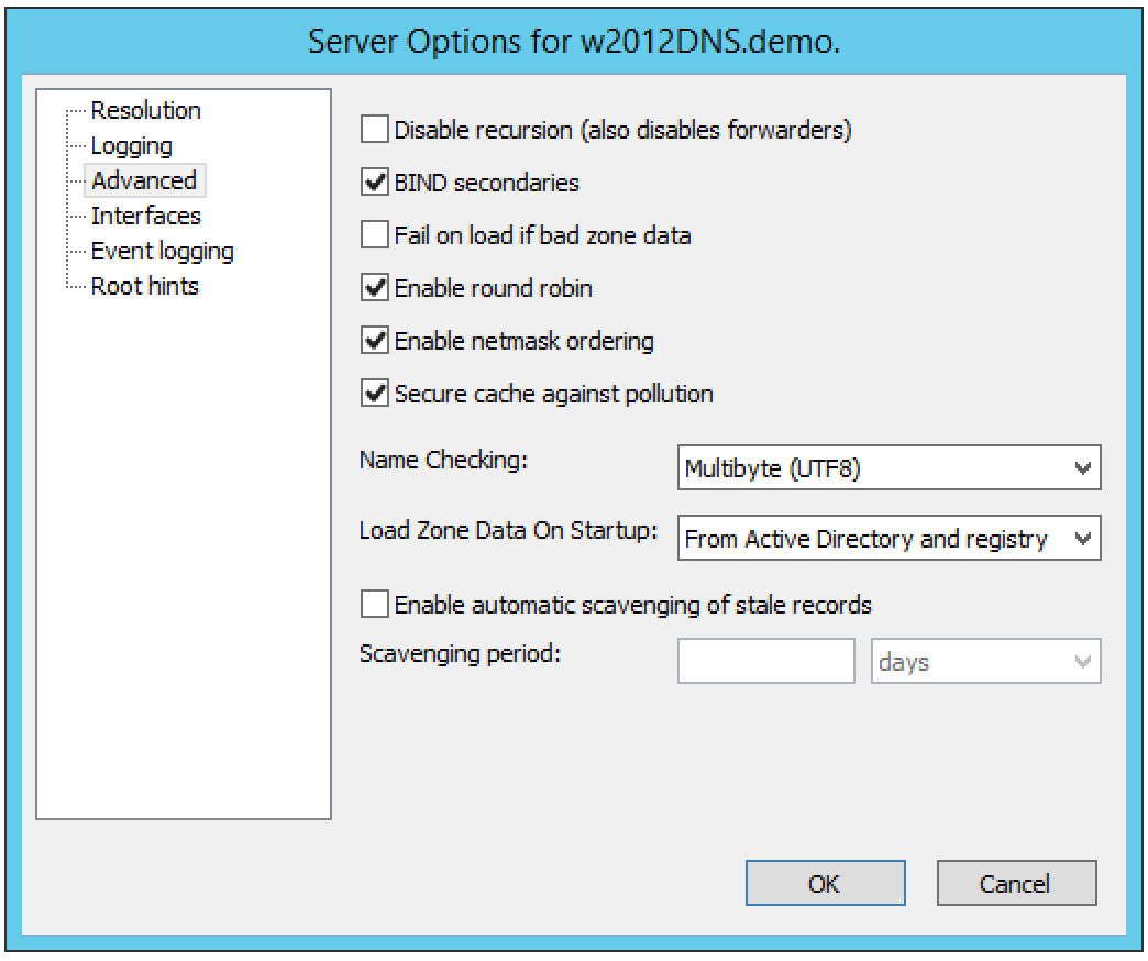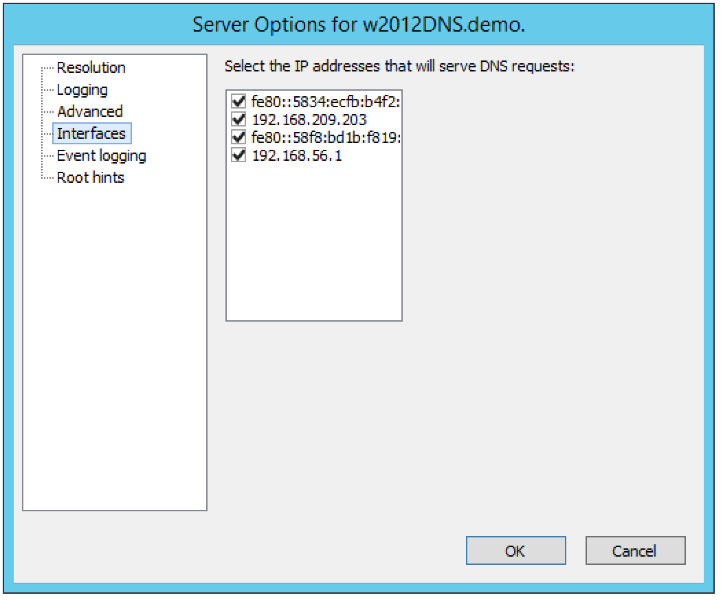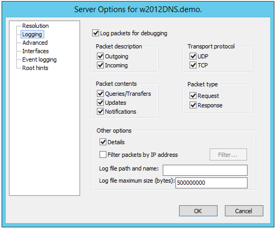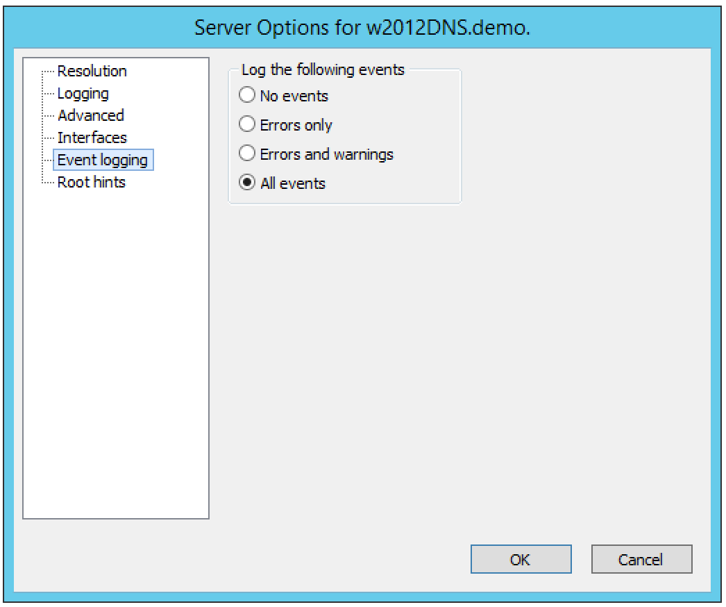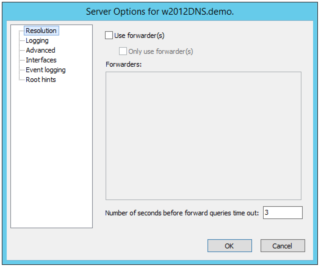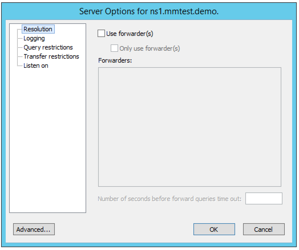 Choose the desired option (Resolution, Logging, Advanced, Interfaces, Event logging, Root hints) from the menu on the left. The corresponding options display in the right panel of the dialog box.