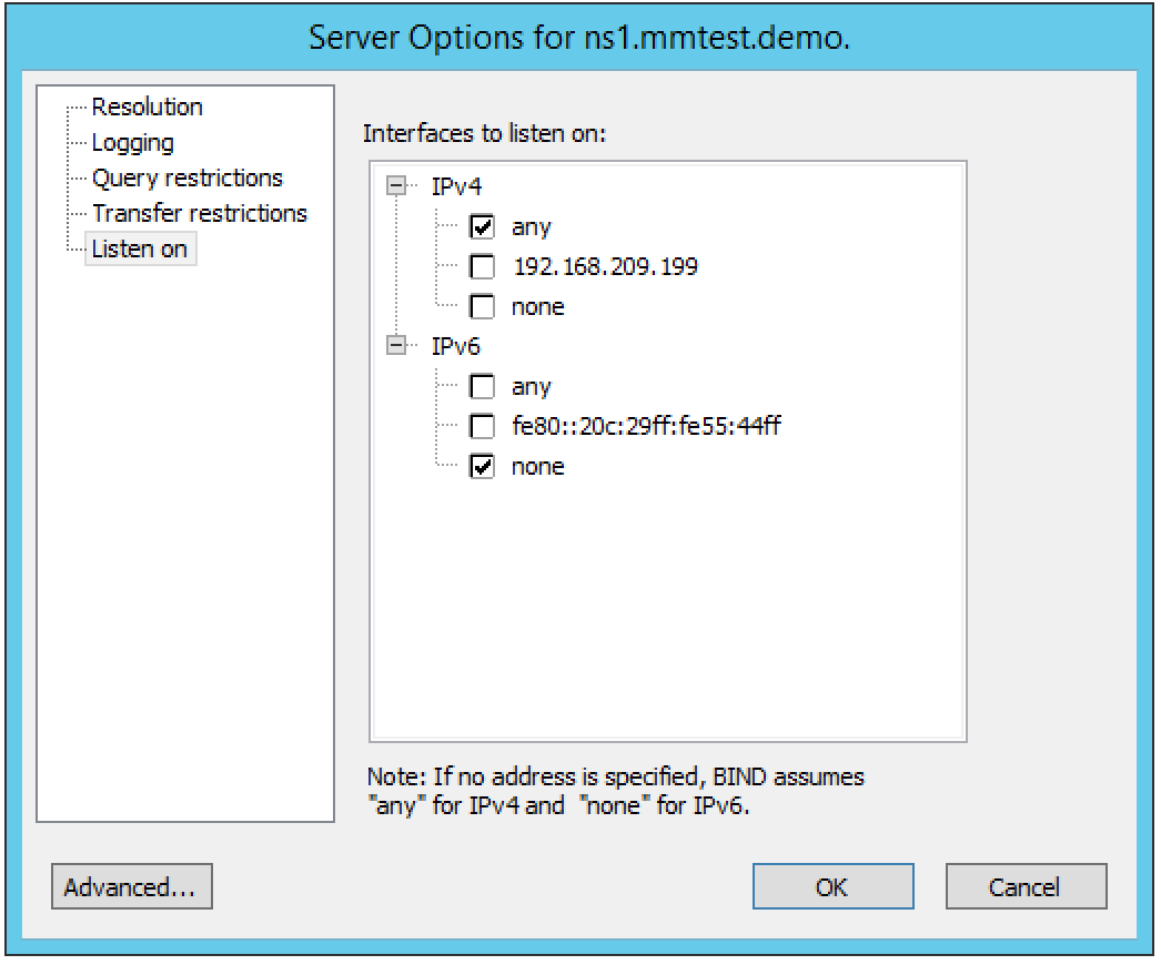The Listen on panel allows specify the IP Addresses this server will use to serve DNS requests.