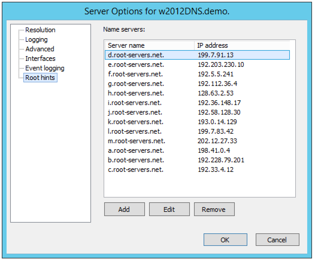 Allows configuration of suggested root servers for the server to use and refer to in resolving names.