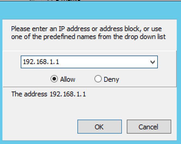 Click the Add button. A small dialog box displays, prompting you to enter the server’s IP Address, an address block, or to use one of the predefined names from the drop-down list (any, none, localhosts, localnets).