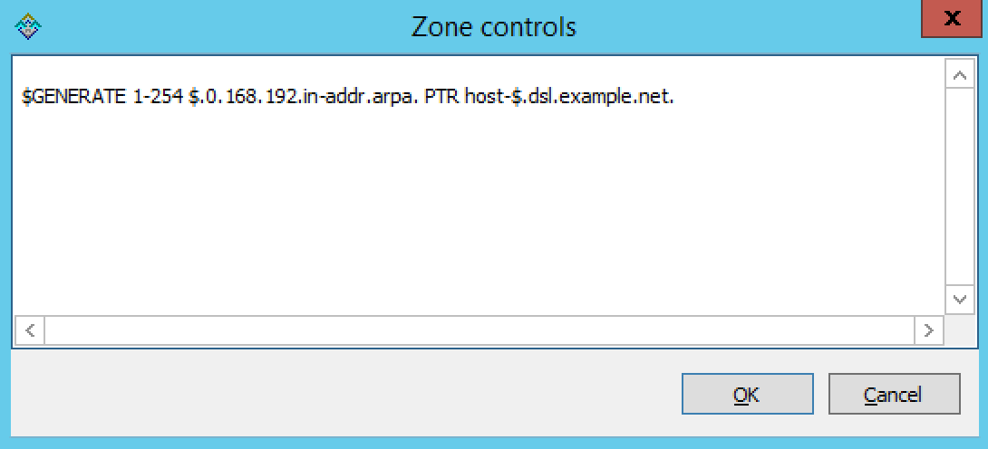 . The Zone Controls dialog box opens, showing any $GENERATE statements that exist in the zone. The $GENERATE statements are shown in a multiline edit field.