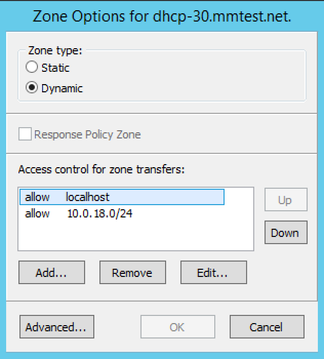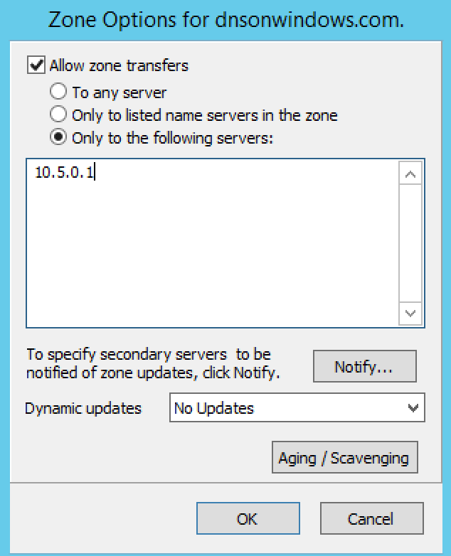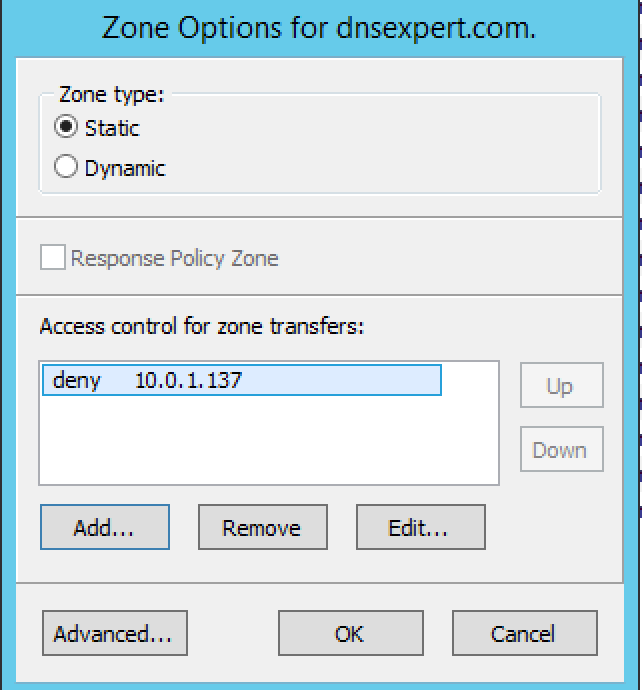 The Zone Options dialog box lets you specify an IP Address (or an address block) from which zone transfers can be allowed, or disallowed.