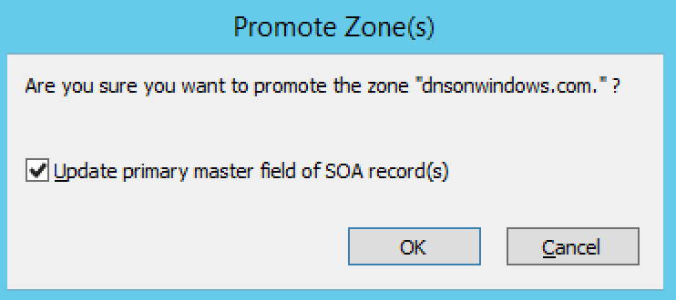 Right-click the slave zone you want to promote and, from the shortcut menu, select Promote to master. An information message displays: