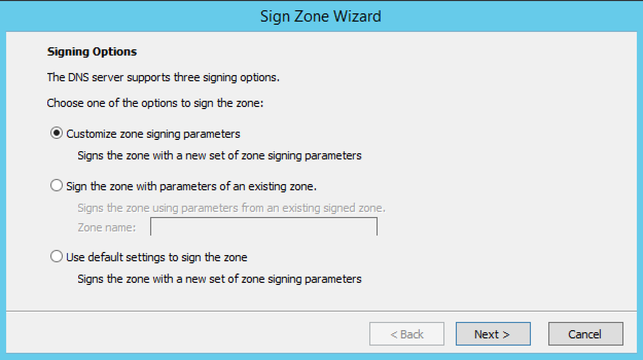 Click Next. If you chose the Customize zone signing parameters option, the zone signing wizard allows you to choose KSK and ZSK for signing the zone. If you chose either of the other options, an overview panel displays in which you can see the zone signing parameters that will be used to sign the zone.
